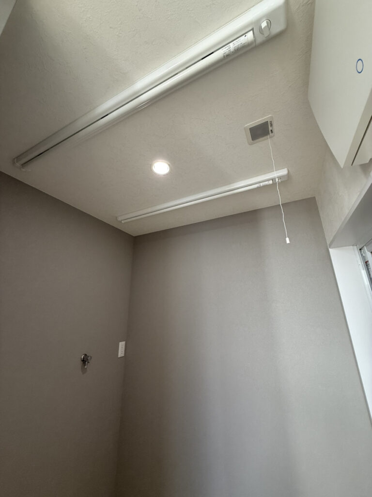 物干しは天井収納が可能。 洗面・脱衣室が分かれているため、家族が同時に使えるストレスゼロの設計。