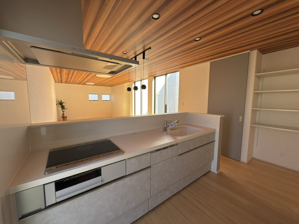 料理をしながら中庭の子どもに視線が届く安心設計。 パントリー付きで収納力も抜群。